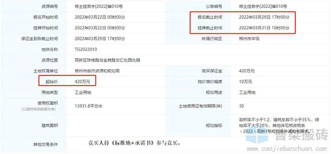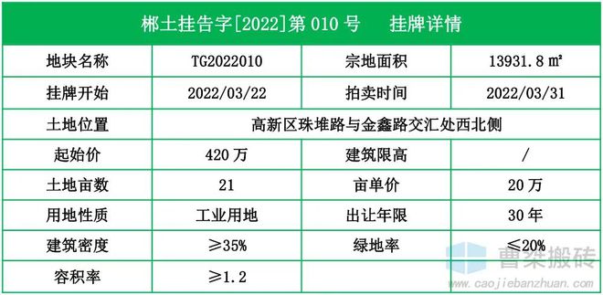 2022年3月1日,郴州市国土资源网挂系统挂牌1宗工业用地:位于高新区珠堆路与金鑫路交汇处西北侧的[TG2022010]地块。